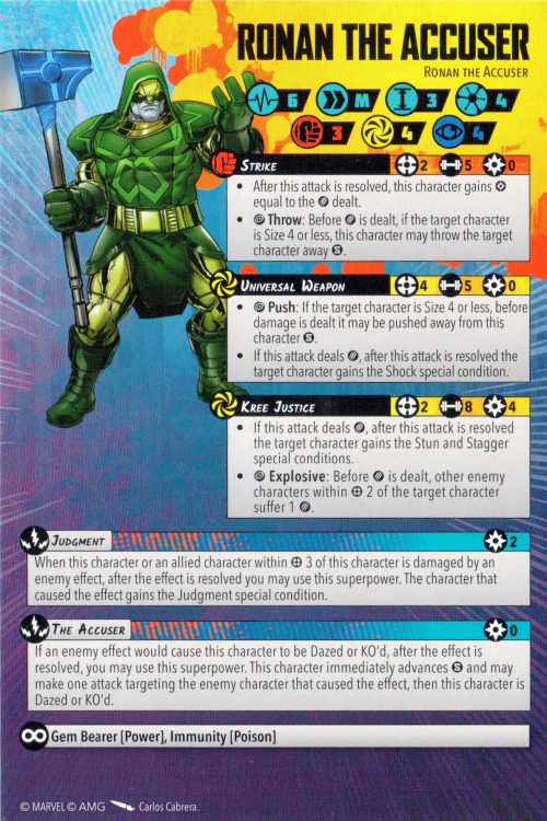 I like this guy way more than I probably should: Ronan brings a couple of particularly interesting things to the table here. First up we have the Judgment special condition, which honestly is below-the-radar filth. If you're not aware, it means when you attack your opponents, they don't gain Power, breaking a core mechanic of the game and choking off their comeback before it even starts.