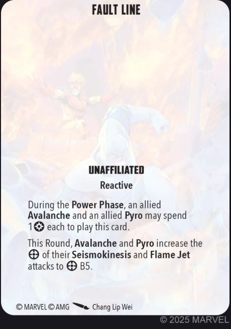 Fault Line is an unaffiliated reactive card that Pyro and Avalanche can play 1 power each to play. This round Avalanche and Pyro increase the range of their beam attacks to 5. On certain map types where the secures are lined up this could be interesting. It's certainly more interesting on Pyro than Avalanche as Pyro can add dice to the beam with his Stoke the Flame ability. Avalanche's beam will only ever be four dice. Additionally, Pyro can bounce incinerate to multiple people with Fire manipulation, and this could help that. Overall, because of how lackluster Avalanches beam is, I'm not convinced this is worth it outside of fun games. On top of that, the War of Kings Crisis Pack has removed most of the down-the-middle Crises that would love a beam like this.