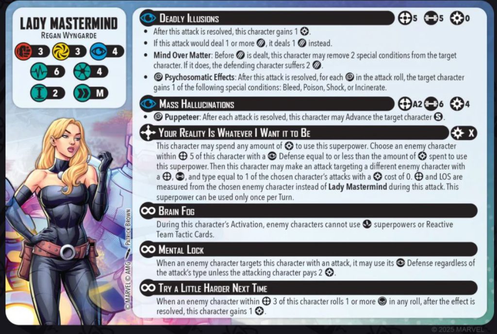 Lady Mastermind looks to be one of the most fun characters that AMG have made in a long while. It will likely take a bit of skill to pilot her properly, as you need a good understanding of what 0-cost attacks your opponent has access to, and you'll need to pay attention to opponents rolling dice near her to keep her topped up on power. She will have interesting play in her home affiliation of the Brotherhood of mutants and may also see play in affiliations that can give out a lot of special conditions, such as Baron Strucker's Hyrda.