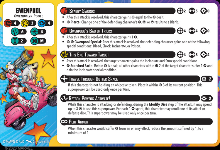 Gwenpool is a 4-Threat character with 4/3/4 defenses, 6/6 stamina, and a medium move. She has two physical builders, one at Range 2 with 5 Attack which can Pierce; and one at Range 4 and 4 Power that can inflict one of a variety of conditions with a Hit and a Wild. Neither of these are especially impressive, but Gwenpool’s rocket launcher spender This End Towards Target is an appropriately explosive Range 4, 8-dice attack for 4 Power, that automatically inflicts Incinerate and Stun on the target, and causes 1 damage and Incinerate to all characters within Range 2 of the target on a Wild.