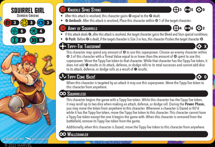 Squirrel Girl is a 4-Threat character. She has a fairly humble 3 Defense across the board, 6 Stamina on her healthy side, 5 on her injured side, is Size 2 and has Medium move. So far, not so impressive.