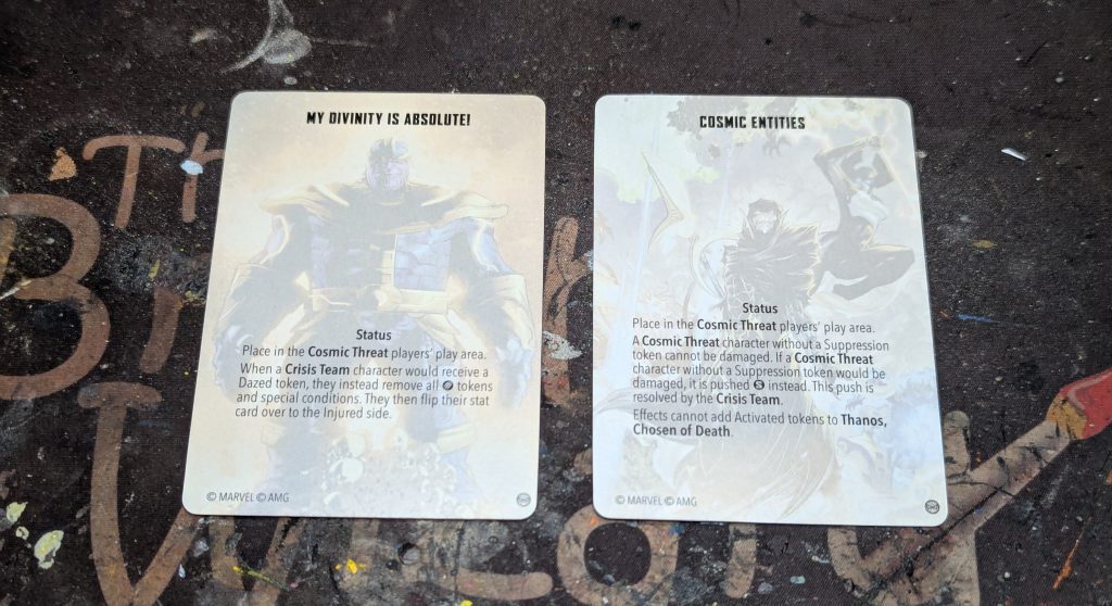 Cosmic Entities is the card that allows Cosmic Threat characters to be immune to damage, unless they have a Suppression token. If they would be damaged while they don't have a Suppression token, they are Pushed with the Short movement tool instead. Also, Thanos, Chosen of Death ignores being given an Activated token by any attacks or effects that would give characters an Activated token. Sorry Ulik, Thanos is shatterproof.
