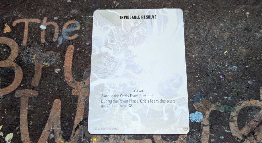 The Crisis Team has access to Inviolable Resolve, sometimes. With this card in play, the Crisis Team has been boosted and each character gains an extra power during the power phase. This should help open up some plays during the game, allowing you to interact with objectives and lay the beat down with your heavy hitters. It should be noted that, according to the difficulty chart, this card is only used during the Narrative version of the scenario.