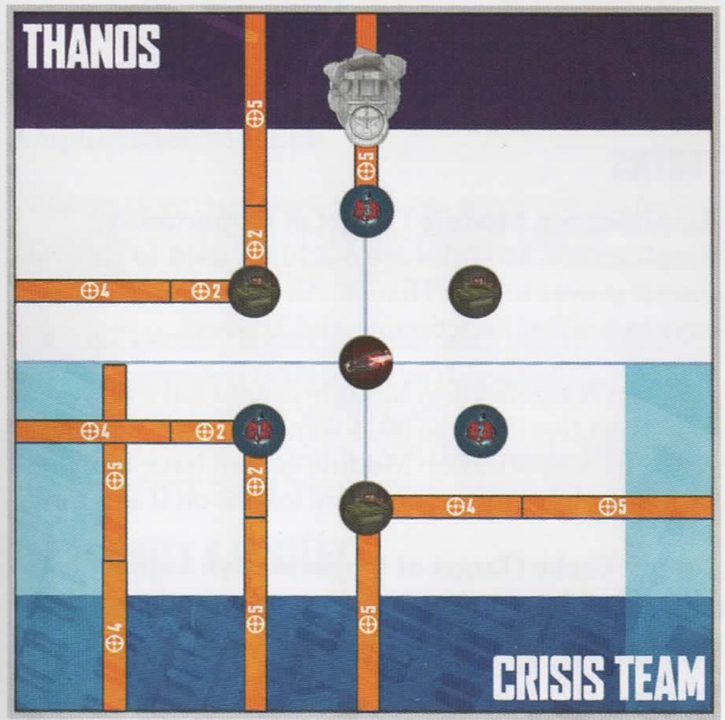 For this scenario, Thanos' throne is set up in the Cosmic Threat player's deployment zone and Thanos deploys from the base slot in the throne. The Nullifier Beam is placed at the center of the battlefield, surrounded by Amplification Modules and Supply Caches. The Crisis Team shares a deployment zone on the opposite side of the battlefield and deploys within range 3 of their battlefield edge as normal. Additionally, on each side battlefield edge, the Crisis Team may deploy one character within Range 2 of the edge and between Range 4+5 of their normal battlefield edge. This will allow them to get deeper into the table at the beginning of them game, at the risk of being Thanos' first victims.