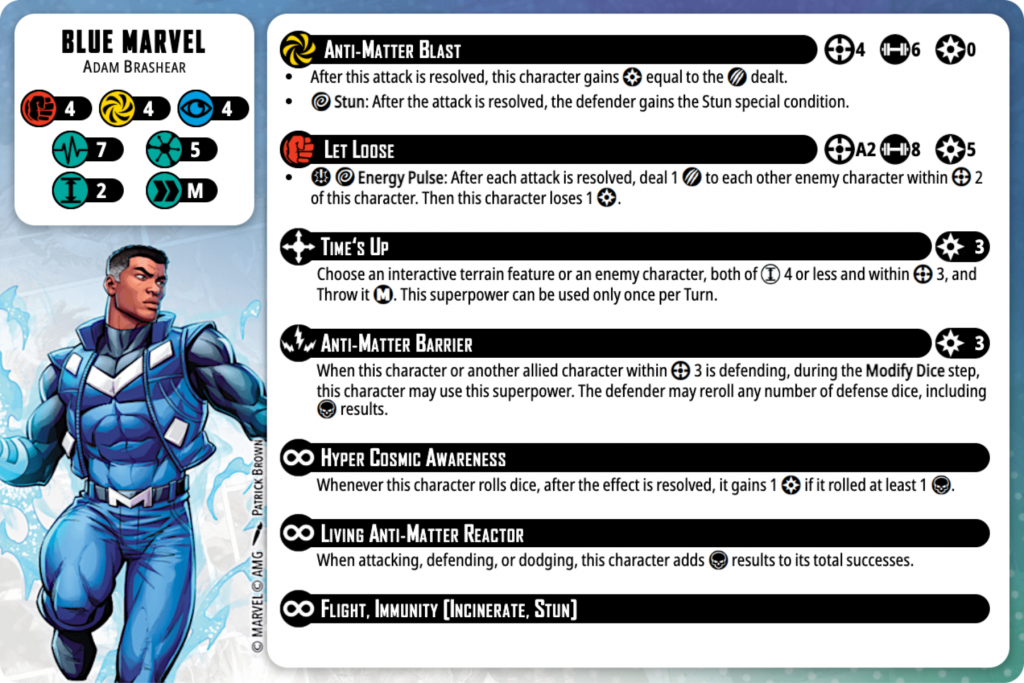 Blue Marvel feels…boring? And I don’t mean that as a pejorative, either. He seems incredibly consistent for whatever you want him to do. He is immune to incinerate, so he can always roll his maximum defense dice, and he counts Failures in his attack, defense, and dodge rolls, so he has another die face that is beneficial to his rolls. He has displacement, he can help his allies, he can attack from the relative safety of Range 4. And he should be pretty flush with power through the game and his immunity to Stun. Is he flashy? No, not really. But I think they did a great job of capturing the strength of the character as well as his utility. I want to play him in as many places as possible.