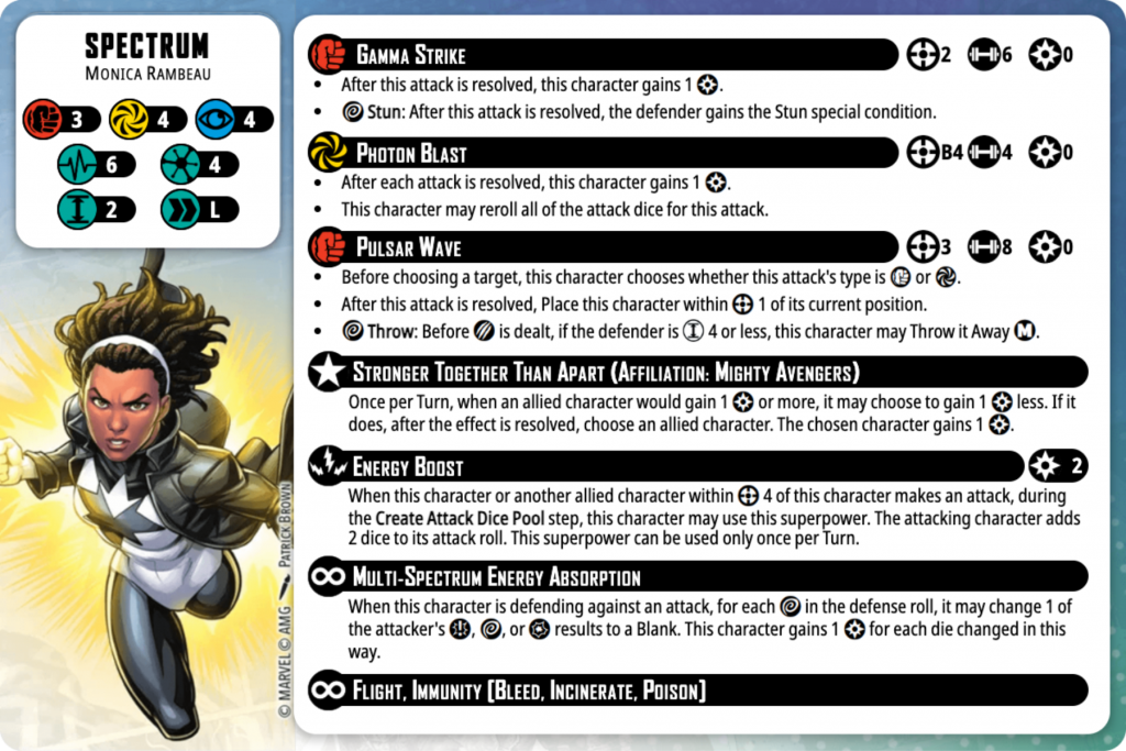 As an editorial note, at the time of writing, AMG had not issued a correction for the mistake they said was in the Panel to Play for Spectrum. That being said, I do not expect her Spender to remain 0 Power Cost. Again, I think this character design is a win for nailing the character as she appears in the comics. She is incredibly fast with her L move to get wherever she needs to be. Her first two attacks are also decent, and I think the B4 Gainer will be the attack that is used most often because of the consistent power gain and the ability to keep her relatively safe, while also keeping her in range to boost the attack dice for her allies. Also, I think her leadership ability Stronger Together Than Apart is going to be one of the stronger leaderships in the game, because it is an unlimited-range power-sharing leadership, and those tend to be pretty good. It also does a great job of gamifying her leadership style in the comics, which is getting the most out of the Mighty Avengers by working together. I’m also really interested to see the new affiliation list for the Mighty Avengers to see how deep into the comics they go with it.
