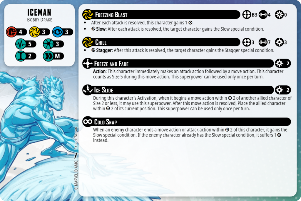 This is the first model in this series where I have to remind myself that the game versions are snapshots of the comics versions. This is NOT Omega-level Bobby. This is very early Bobby, who wasn’t a powerhouse, which I think is represented well by the fact that he only has a 1 power gainer, Freezing Blast. However, I think AMG has done a good job of translating the version of Bobby that puts his allies in a position to be most effective. He can do this by moving them with his Ice Slide, or by handing out Slow and Stagger conditions to his opponent. He’s also pretty fast with his medium move on a medium-sized base, which can really help him impact multiple points of the battlefield.