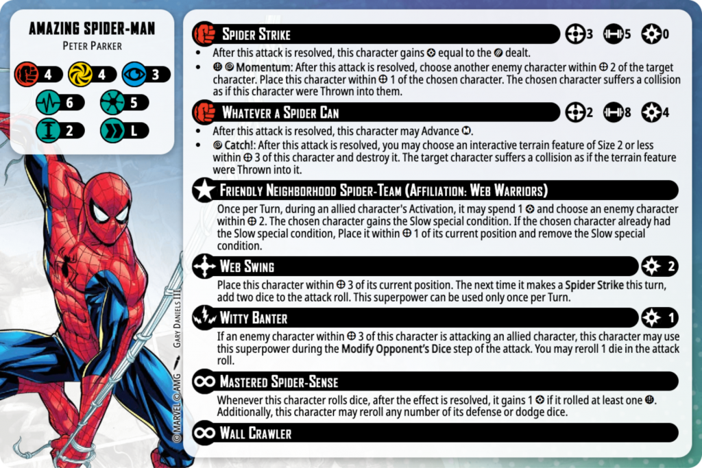 Let’s start with Peter Parker, as there are multiple versions of him currently in Crisis Protocol. The original, 4-threat Peter Parker is…not very good. I think he is a victim of very early character design, and could really use an update. Additionally, he suffers from there being two amazing (no pun intended) other versions of Peter Parker in the game. For a threat less, you can have Spectacular Spider-Man. I honestly think this is a better version of a young Peter Parker than the 4-threat version. He’s incredibly reliable, but not overwhelming. For 5-threat, you can have Amazing Spider-Man. This version of Spider-Man is a more experienced version of Peter. He has a leadership for Web Warriors that can either hand out Slow or place an enemy model within Range 1 of itself for a Power Cost of 1. Additionally, he can re-roll any of his defense or dodge dice because he has completely mastered his Spider-Sense. This model was fantastic before the new Web Warriors were revealed, but with the new additions to the affiliation, I think his leadership will see the table even more. Why hasn’t his leadership seen the table much? Well…