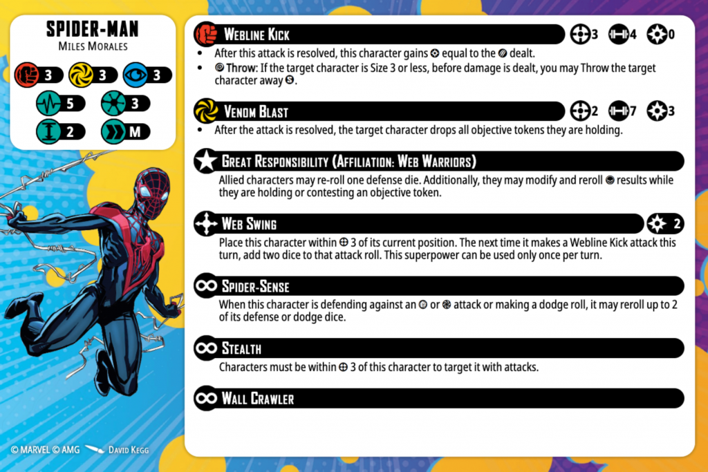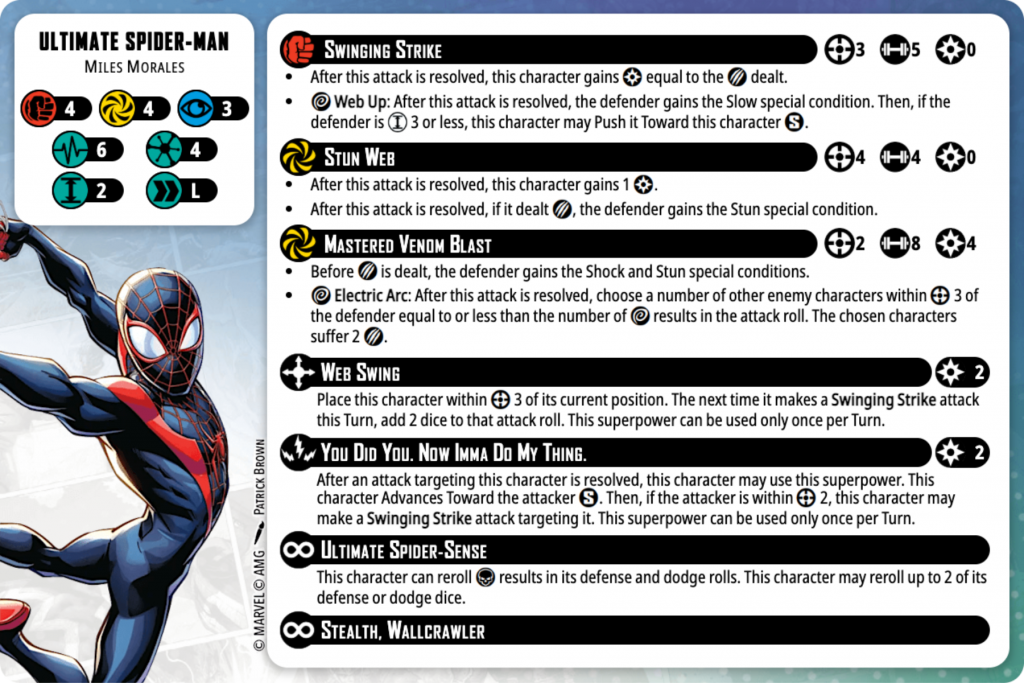 3-threat Miles Morales is, by popular opinion, one of the best 3-threats in the game. His leadership is incredible. It gives Web Warriors an additional re-roll on their defense dice (which most of them already have with Spider Senses), and if they are holding or contesting an objective, they can re-roll Failures in all of those re-rolls. He also has a Range 3 place with his Web Swing ability, which then adds two dice to his basic Swinging Strike attack. Additionally, his Venom Blast attack forces an opponent to drop all objective tokens they are holding. Amazing, amazing character. And I think that this is a great version of a younger version of Miles before he has really tapped into the full potential of his powers. The biggest weakness of Ultimate Spider-Man might be that he shares an alias with his 3-threat version. However, this 4-threat version of Miles is fantastic, and presents an amazing representation of an older, more experienced Miles. This would be the version of Miles present in Secret Wars.