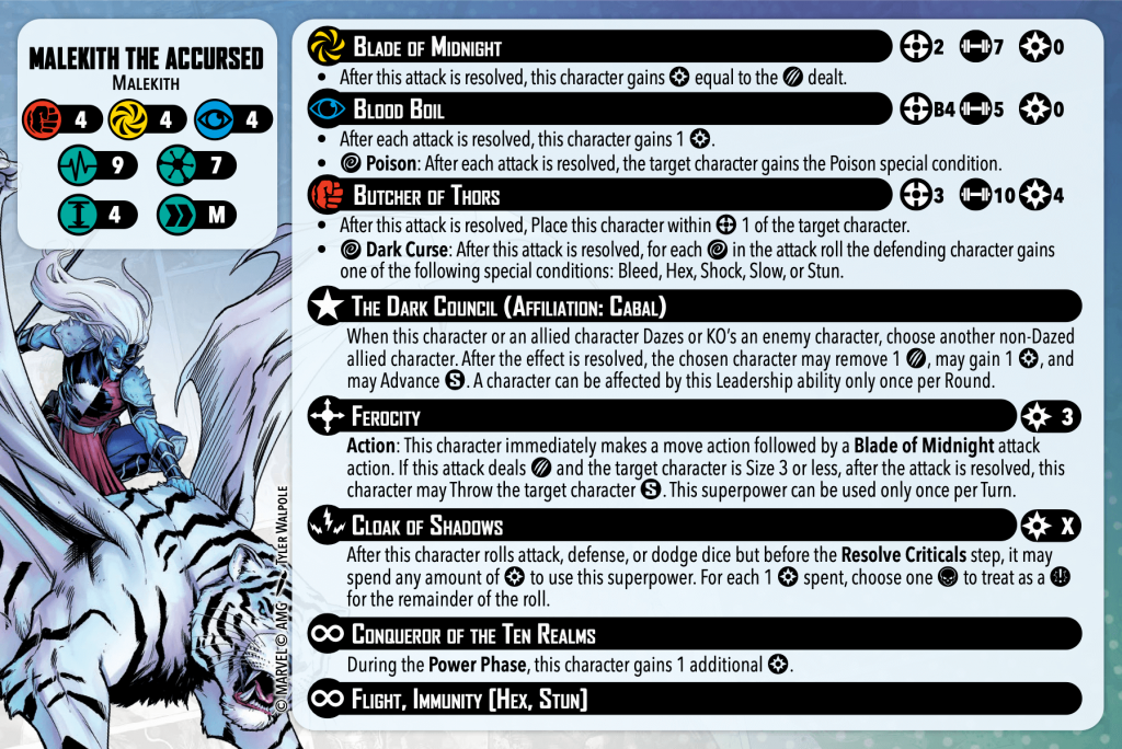 Malekith is only Cabal, adding to the “Dark Asgard” side of the affiliation with Loki, Ulik, Enchantress, and Skurge. There was a time when Malekith was everywhere, but as he’s been bonked multiple times with the Nerf-bat, he frankly even rarely sees play in his own affiliation.