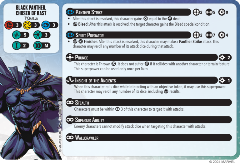 Black Panther, Chosen of Bast has fairly standard stats for a 3 threat. Defensively he has 5 health on both sides and 3/3/3 defences. He also has the stealth superpower preventing attacks from coming in from outside range 3 and passively prevents opponents from modifying dice against him. He has a medium move on a medium base which puts him a little faster than the average 3 threat character when base size is taken into account.