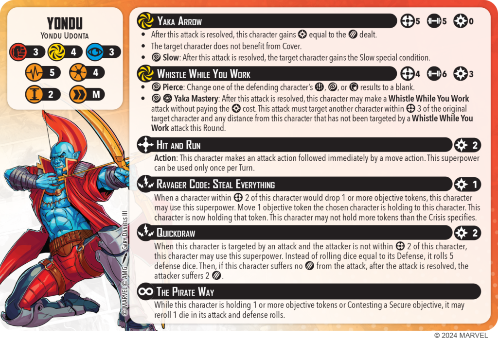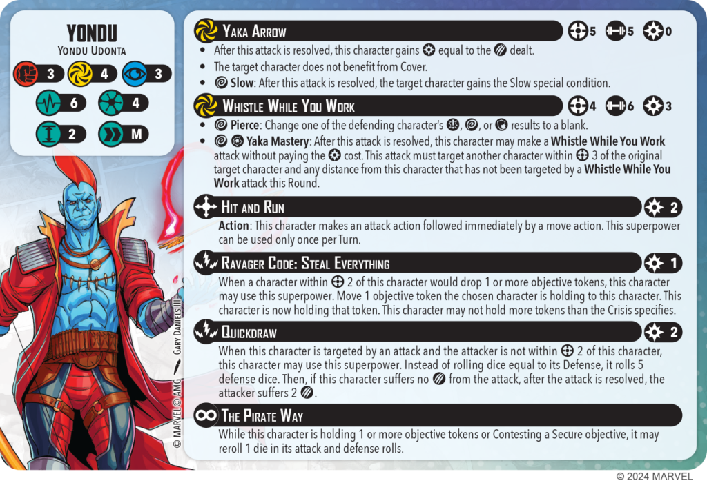 Additionally, Yondu has three superpowers to choose from. He has a standard Hit and Run and Quickdraw (similar to Martial Prowess, but operates outside of Range 2 instead of within Range 2). His third superpower, however, is really spicy. For 1 Power, Yondu can use Ravager Code: Steal Everything which is essentially Mission Objective in superpower form. In practice, I think Yondu players will want to use this to keep objectives when an ally drops them instead of an enemy character because Yondu really doesn’t want to be within R2 of enemy characters. But this superpower is huge, and I think is going to be a contributing factor to seeing Yondu splashed outside of affiliation. Lastly, he has the innate superpower The Pirate Way, which allows him to reroll 1 die in his attack and defense rolls, and since it has it’s own unique name, it will stack with other re-rolls you may have in your roster, including a Winging It token.