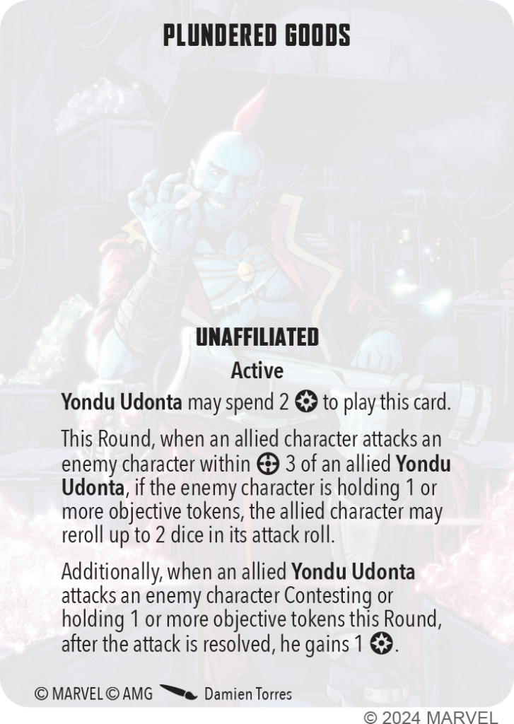 Yondu also comes with an unaffiliated Team Tactics Card, Plundered Goods. It costs 2 Power, and critically, it lasts for the entire Round. It also has two separate effects that are always on, too. The first allows allied characters to re-roll 2 attack dice when they target an enemy who is a) within R3 of Yondu and b) holding 1 or more objective tokens. The second clause states that Yondu gains an additional power anytime he attacks an enemy that is contesting or holding an objective token. Overall, I think this card has a lot of utility if you play it on that one Round where you have to daze/KO models. The problem with this card, however, is that Guardians have a lot of good cards to choose from for your 5, and I just don’t know if this makes the cut.