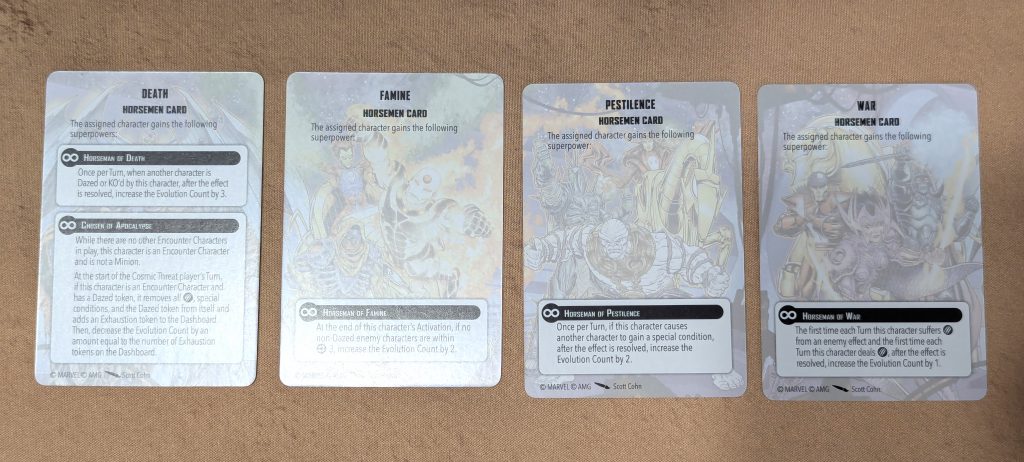 The players will want to balance out their character choices between people who can move around quickly to place Sabotage tokens and folks who can dish out some damage to thin out Horsemen and handle Apocalypse later in the game.