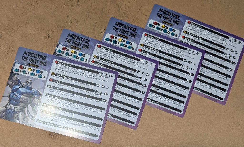 If the Crisis Team was very successful in their attempts at deleting Celestial Technology and dazing the Death character, Apocalypse will come into play in his weakest form. But if they are not, will come into play at either evolution levels 2-4. Each version of Apocalypse comes with a slightly better kit, gaining better defenses, some new superpowers and some of his attacks change slightly.