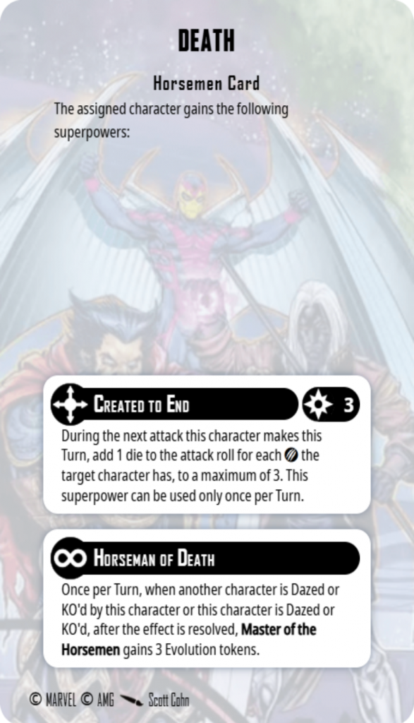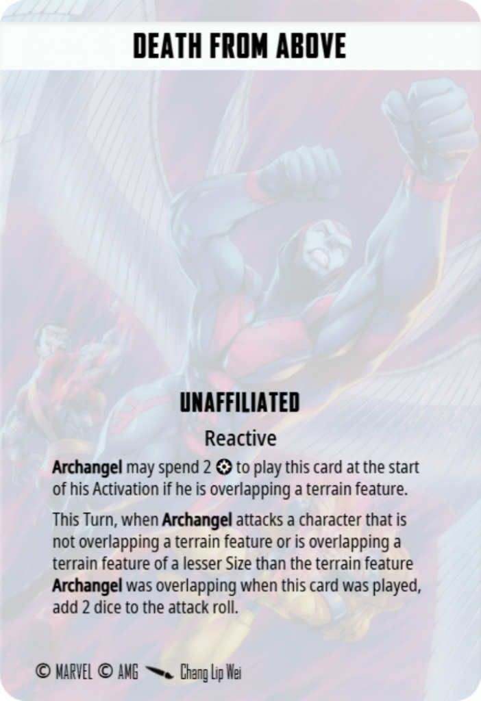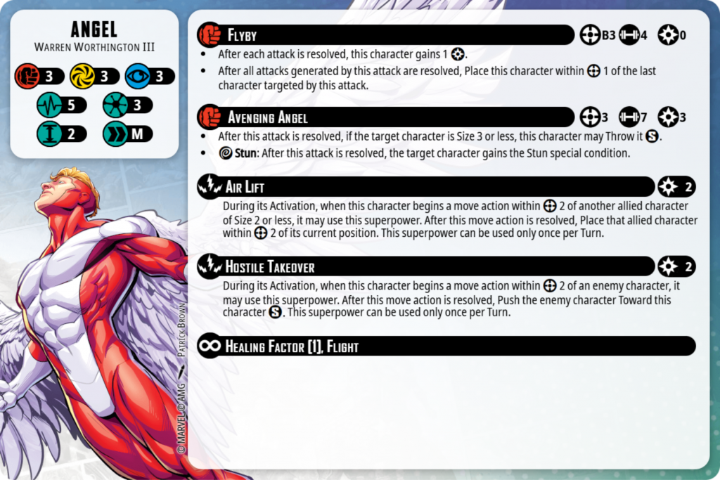Another medium base being added to X-Men is no joke. Not to mention his superpowers costing 2 power each. That makes Angel a great fit for either Storm or Professor X led X-Men rosters. So let’s dive into what he can do on the table.