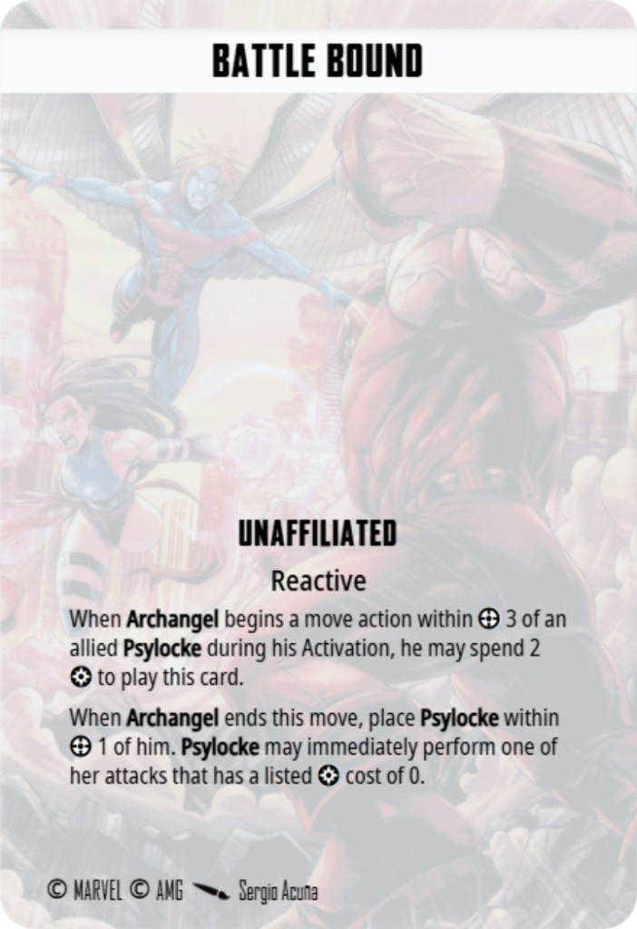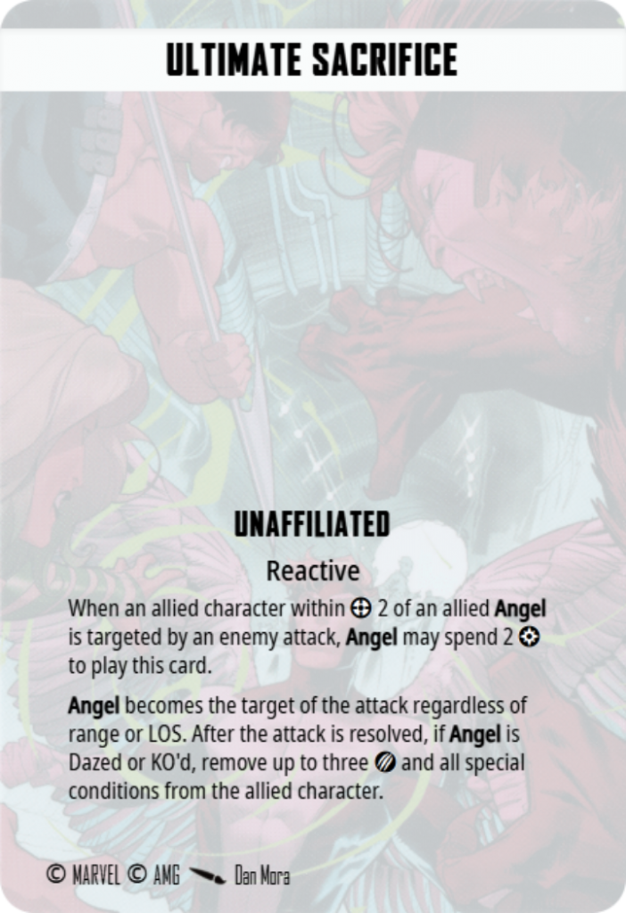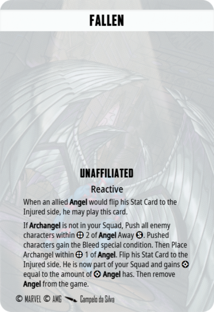 This card is COOL! Is it competitive? Maybe not. But upgrading your 3 threat to a 4 threat is no joke. The problem here however is that Archangel is pretty easy to KO on his injured side, but since this happens during the Cleanup Phase (I hope you’re listening Phoenix Unleashed…this is how you protect yourself from getting KO’d too soon) - so long as you have priority, you’re likely to get at least 1 meaningful activation from your new 4 threat.