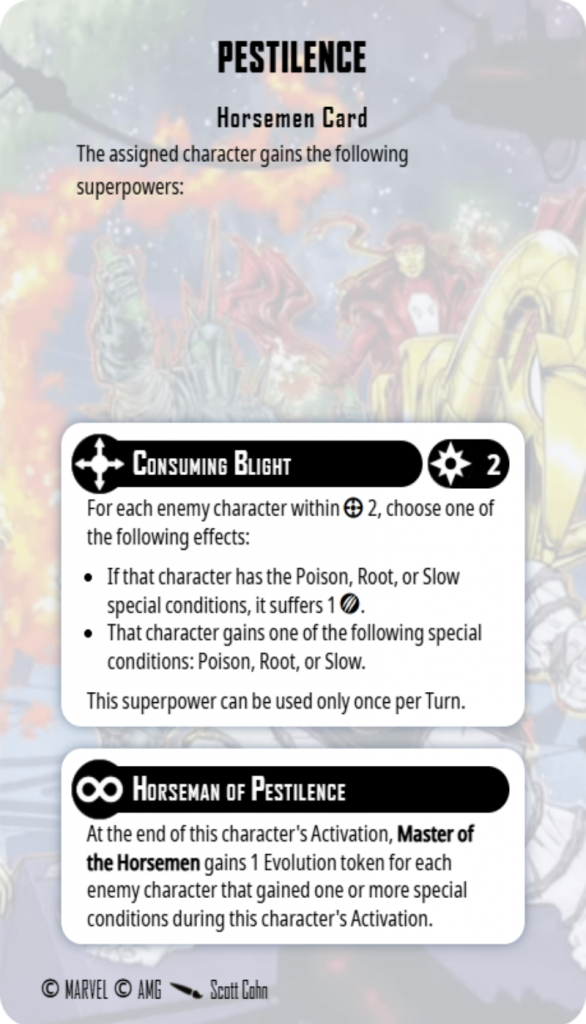Toxic Flechettes is cute. Bleed or Poison are both fine conditions to dish out, but it’s 1 condition per wild. So I guess the Horseman of Death isn’t quite as good at infecting people with ailments as a robot like Ultron, Metal Tyrant,