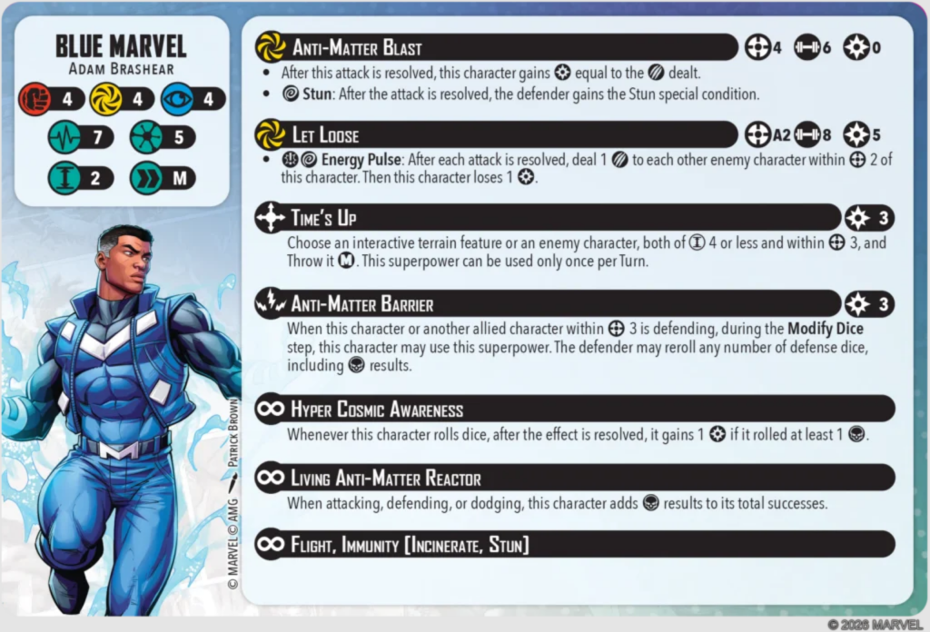 Anti-Matter Barrier. So if we’re discounting his spender as ‘niche’ and not that worth it…what else is Blue Marvel going to be spending all of his power on? This! Re-rolls on whiffed defence dice is nice - and this lets you keep your successes and try again with the rest, including Skulls. It’s nice and will definitely come in handy.
