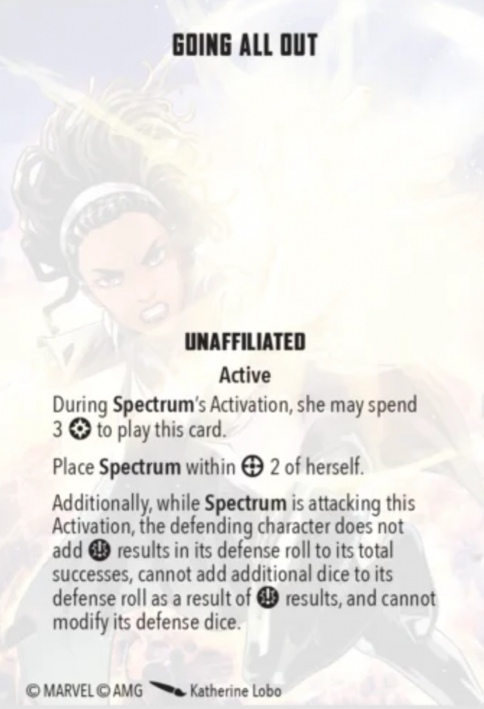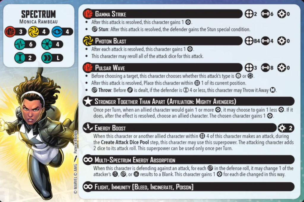 Multi-Spectrum Energy Absorption is situationally great. Bishop and Captain Marvel can really turn the tide on a fight when they roll Wilds in their defences. If you can find ways to boost defence dice on characters like this, you should. But at least she pairs nicely with Blue Marvel who can give her defensive re-rolls, helping her search for those Wilds.