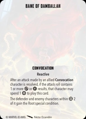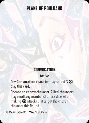 Ferocity of Cyttorak that lets him add 2 dice to an ally’s attack. It’s cheaper at 2 power vs Clea’s 3, but instead of potentially applying Judgement, it gives 1 damage to the attacking ally. It’s a potentially strong effect, but with Convocation models having average to low HP, taking damage for what will average to about 1 extra damage on the defender can be a hard sell.