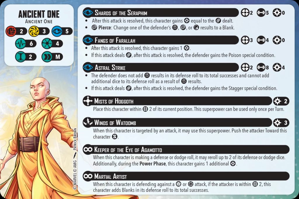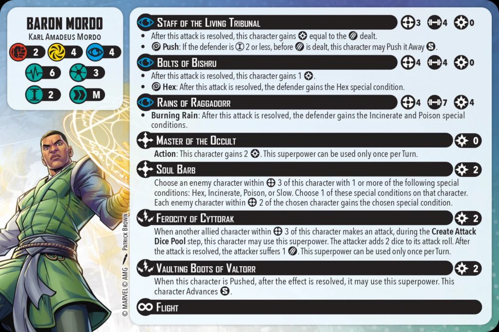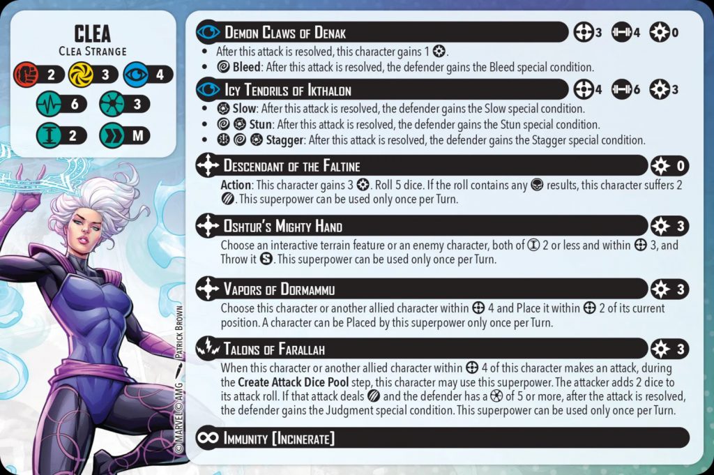 Deadly Daggers of Daveroth (yes, Convocation attack and superpower names are all great) is a bit spicier: it costs a power, but it’s 6 dice to make up for the lack of pierce, shoots at an incredible range 5, and can also be any of Physical, Energy, or Mystic. This combination of free or cheap attacks lets Strange brawl up close and gen power or snipe when the need arises, making it extremely hard to stay outside his threat range.