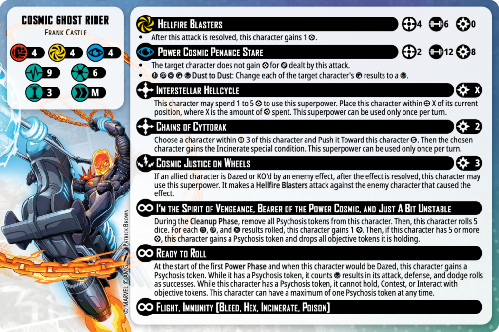 Let’s get this out of the way up front: because of his Ready to Roll ability, do not count on CGR to reliably score you points. If he can, that is just a bonus. Instead, you need to focus on doing what CGR does do pretty reliably: remove opposing models from the board, which he becomes even better at if he has a Psychosis token and counts failures as successes. After turn 1, he should have plenty of power to do what he needs to with his I’m the Spirit of Vengeance, Bearer of the Power Cosmic, and Just a Bit Unstable ability. With his 65mm base, even just spending 1 Power to place within R1 of himself with his Interstellar Hellcycle ability can net him enough movement to still be able to attack twice with his Hellfire Blasters attack.