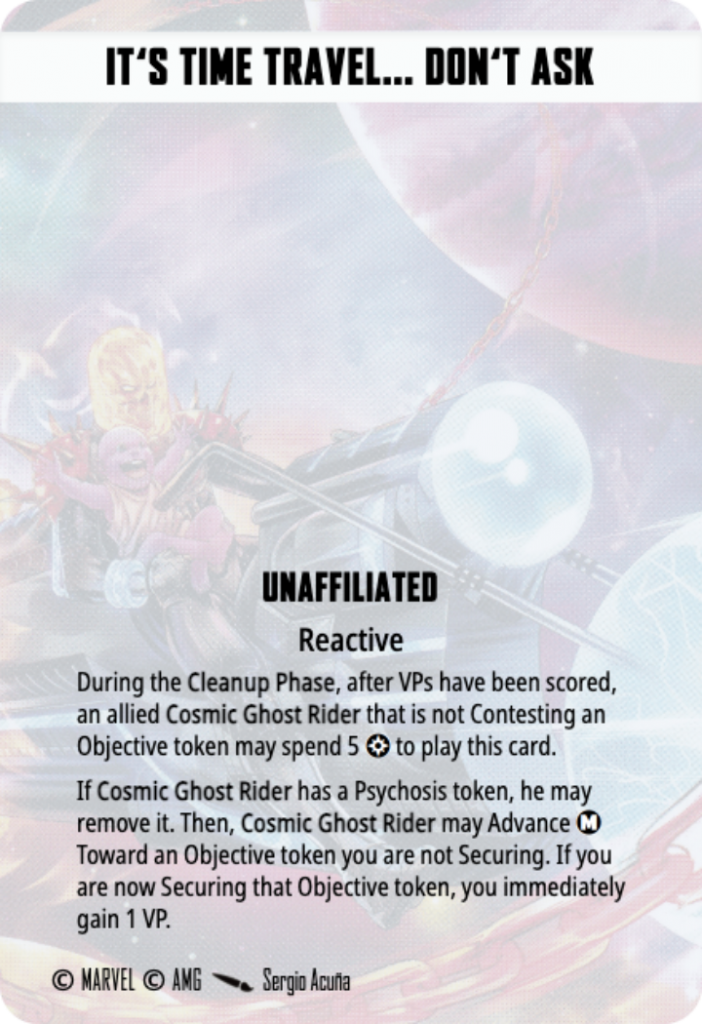 The best part of Time Travel is Baby Thanos riding shotgun on CGR’s interstellar Harley. While it is Unaffiliated, I still don’t think this card makes its way into your Roster. Spending 5 Power from CGR to score 1 VP if he has a Psychosis Token is not a good trade, when he could use that 5 power so much better, murdering other characters on the table. Sleeve it, adore Baby Thanos, and keep it there.
