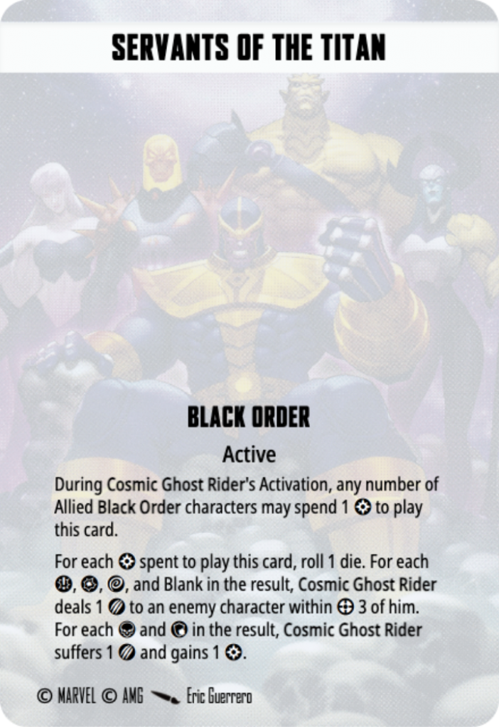 Cosmic Ghost Rider is affiliated with both the Guardians of the Galaxy and Black Order. While one of his specific Tactics Cards is Black Order affiliated, I don’t think that is his best home. That affiliation is already down 8 threat with Thanos, and Corvus’s leadership doesn’t help CGR much at all (since he doesn’t benefit from Dazing or KO’ing opponents), and with the current set of Crises (and lack of an E Secure layout), going extremely tall with your Squad is not a great recipe for success. Hoping to just table your opponent with all of the speed out there in MCP is rough.