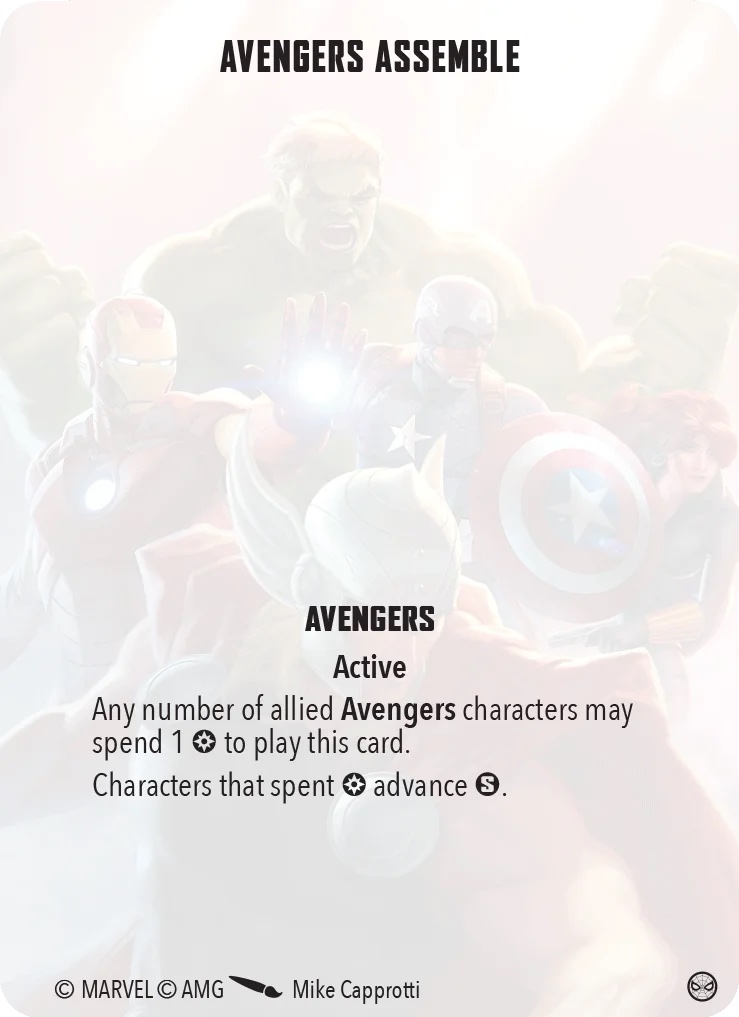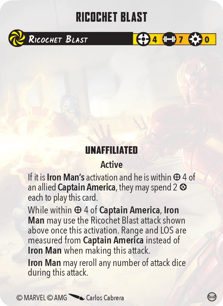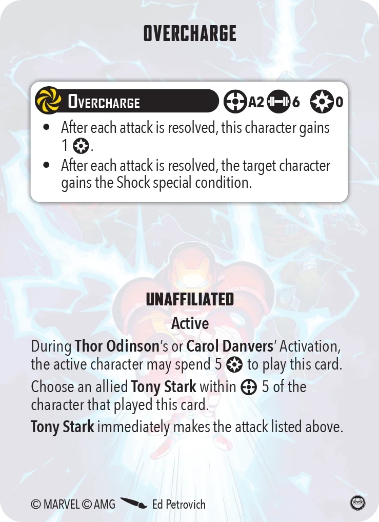 This is a rare ‘free attack’ card. Carol Danvers or Thor Odinson may spend five power during their activation to give Tony Stark a free area attack.