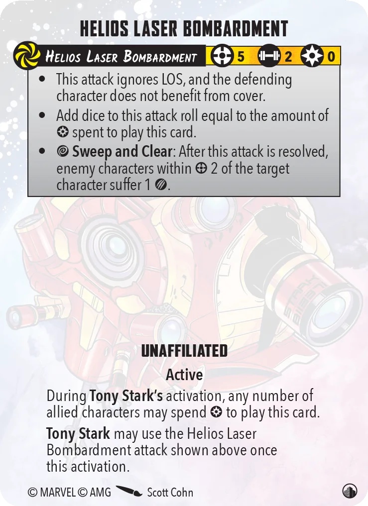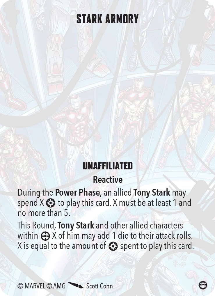 Tony Stark, any Tony Stark, can call on a satellite to make a range 5 attack that ignores cover and line of sight with dice equal to two plus the power spent across the entire crisis team. It’s a solid card. It doesn’t synergize particularly well with a leadership that reduces damage, but the ability to throw 20 or more dice at an enemy model can be a huge moment.