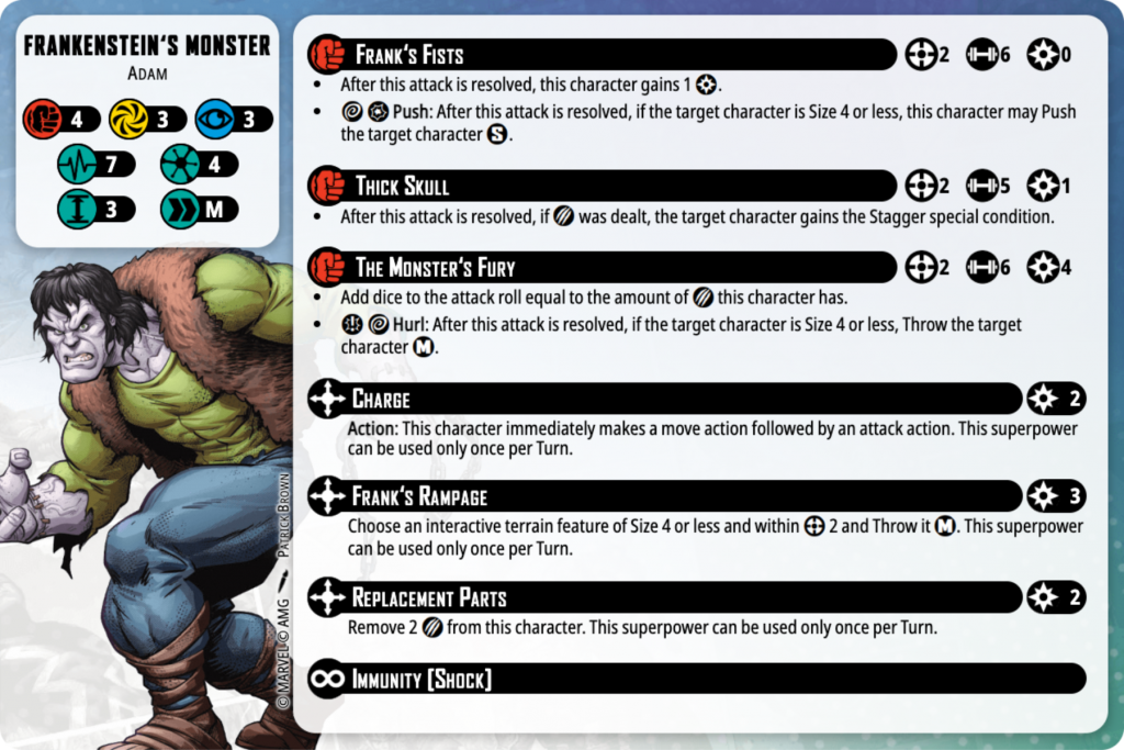 He does gain some action compression with his Charge superpower, but it costs 2 power, which means you probably won’t be able to use it until Turn 2 because of his S movement and his free attack being Range 2. He does have a nice Size 4 terrain throw in Frank’s Rampage, but it costs 3 power. He can also remove 2 Damage from himself with Replacement Parts, but it costs 2 power. If it removed 3 Damage for 2 Power, I think it would be way more beneficial because it would help his overall Power Economy. As it is, however, you either have to use two attacks to get that power back, or take the two damage you just healed again. Frank’s only affiliation is Midnight Sons, which already has one of the best 4-threats in the game (Doctor Voodoo