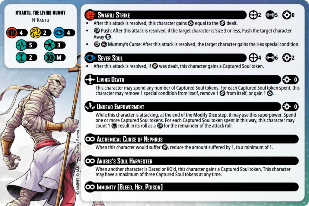 . This is a Range 4, 6-dice Mystic attack that only cost 2 Power. Or one Power and one Sould token. Or two Soul tokens. However you want to pay for it. Additionally, if this attack deals damage, he gains a Soul Token, so it can really fund itself through that system. Lastly, N’Kantu also has damage reduction to a minimum of 1 as an innate superpower and is immune to Bleed, Hex,