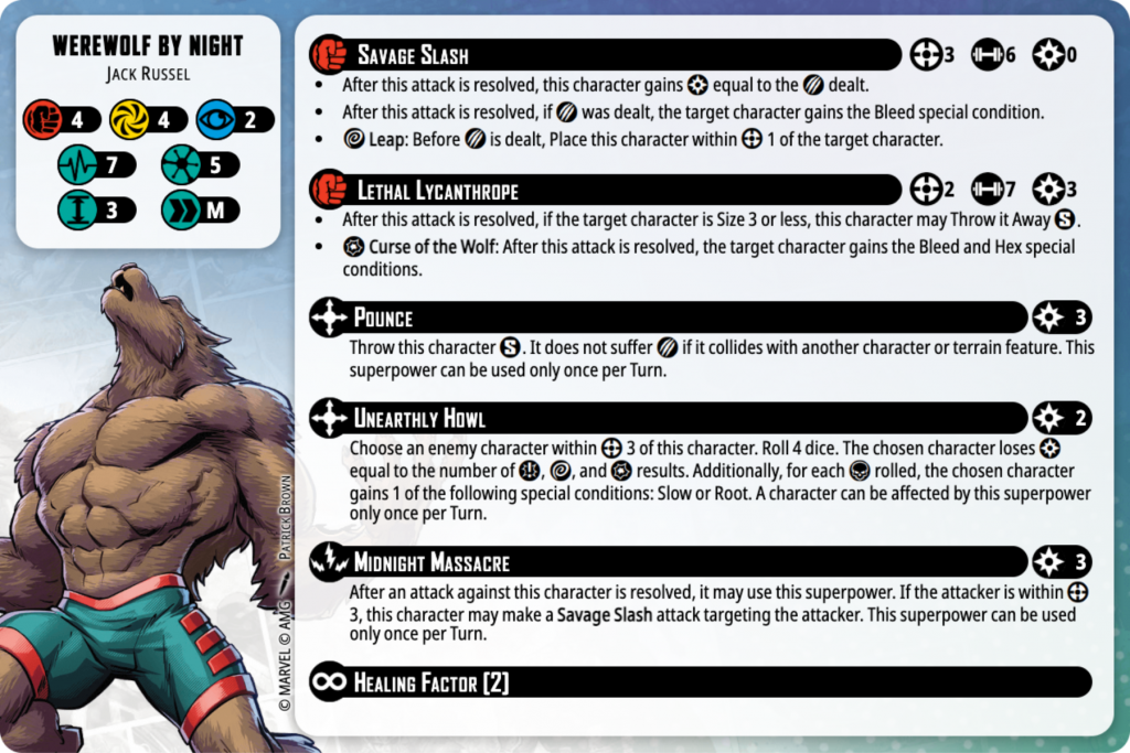 Greetings, True Believers! It’s officially Spooky Season, and in today’s tactics article, we are going to look at the Monsters Unleased character pack! This pack includes 4 spook-tacular characters: Werewolf By Night, Frankenstein’s Monster, N’Kantu the Living Mummy, and Dracula. Because this is a multi-character pack, let’s tackle each one individually and look at their respective Tactics Cards.