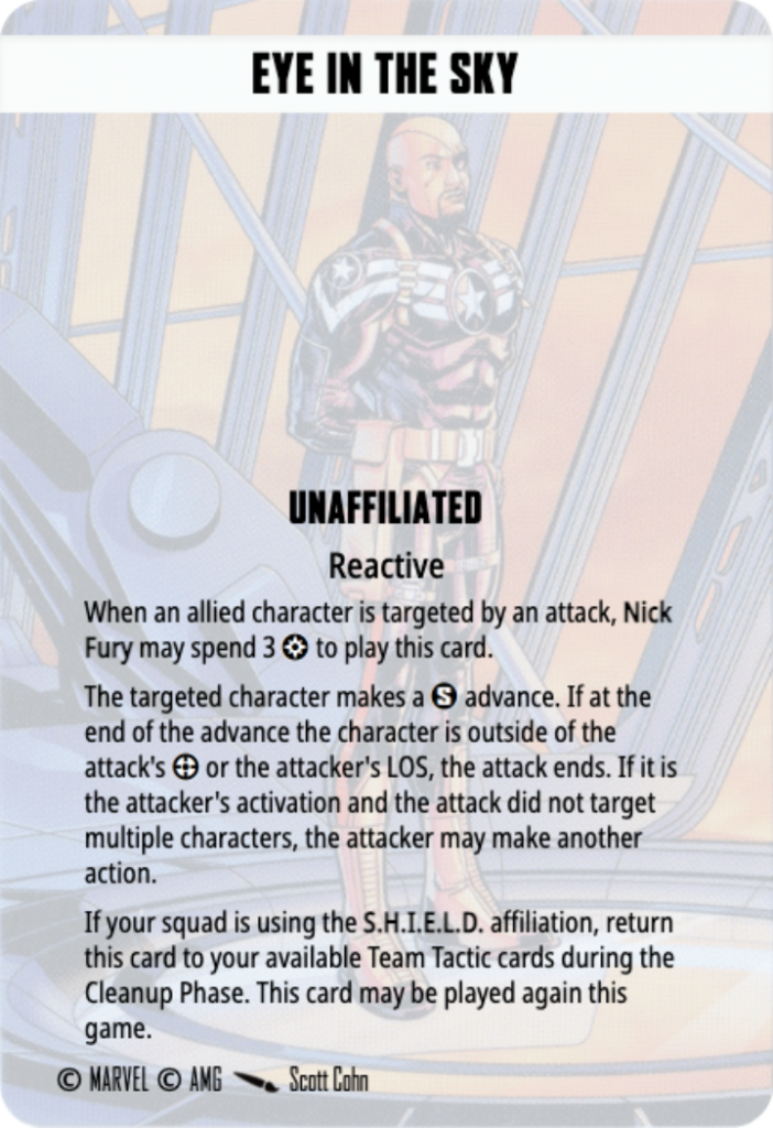 But his best card, which should always be brought if you play him, is Eye in the Sky. For 3 power, which he should have, Nick Fury or an allied character can make a S advance when they are targeted by an attack. Your opponent keeps the power and action, but this can save a character from being Dazed and putting you in a really bad position. Additionally, if you are playing the SHIELD affiliation, you can play this card once every round of the game.