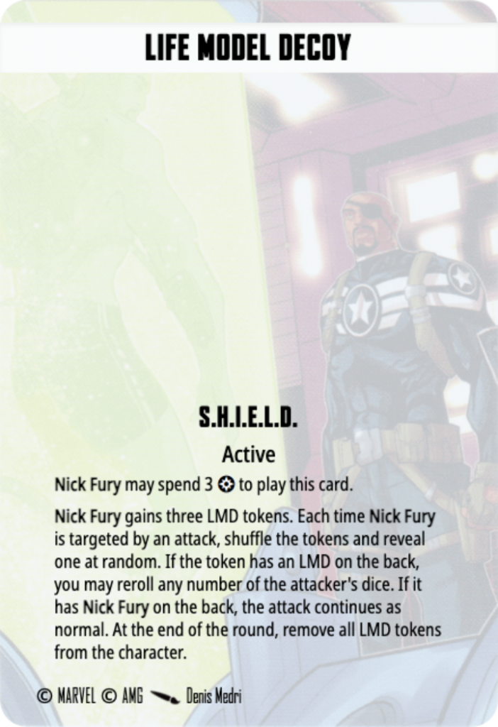 Nick Fury has three Tactics Cards associated with him. One is cute, one is useful, and one is one of the best Tactics Cards in the game. Let’s start with the cute one, Life Model Decoy. First, you have to spend 3 Power (the equivalent of Lead From the Front) to have the chance of re-rolling an opponent’s attack dice for a round. I don’t think I have ever seen this card played or taken.