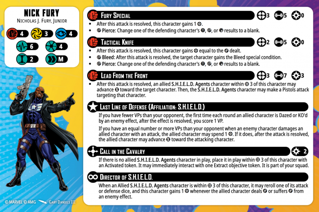 Nick Fury’s Spender Lead From the Front may not look like it, but it is one of the best in the game, and part of the reason you want to make sure you have Grunts on the table. For just 3 Power, Fury gets to attack with 7 Physical dice at Range 3, which would be fair for a Spender attack if that was all it did. Not great, but fair. However, in addition to that, if his SHIELD Agents are within Range 3 (which they should always be), they can advance S towards the target and then make a Pistols attack with re-rolls and Power Generation still in effect with that Pistols attack. So for 3 Power, you’re effectively throwing 11 dice with a re-roll and have the possibility of refunding one of those spent Power. And with how he generates Power, it’s not that uncommon to use this attack twice in a turn.