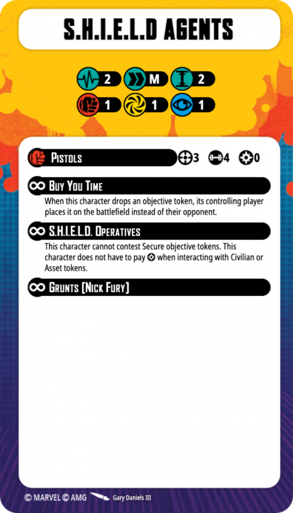 Before we talk any more about Nick Fury, we need to discuss his Grunts, S.H.I.E.L.D Agents, a little bit more because so much of his kit revolves around them. They are fairly typical Grunts in that they can’t generate power and all that, and they have a typical stat line of 1/1/1 defenses and 2HP. What makes them unique is that they can interact with Extracts for free, and if they drop an Extract, you can choose where to drop it thanks to their Buy You Time ability. They also have a fairly strong 4-dice Pistol attack at Range 3.