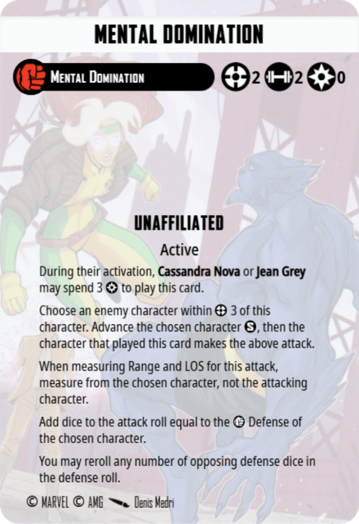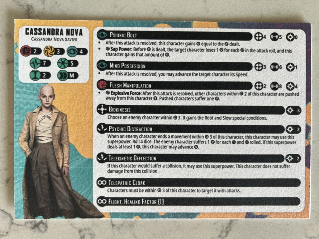 Cassandra Nova has a ton of tricks up their sleeve - and a lot of text on their card, some of which barely gets used. Flesh Manipulation and Biokinesis are both far too expensive for Cassandra to pay for and don’t quite fit into the play style of the character or the affiliation in my experience. Power is better spent for Mind Possession, Psychic Distraction and sometimes both at the same time (the advance granted by Mind Possession will trigger Psychic Distraction for a nice one-two). Psionic Bolt being Range 4 means it can be used while Cassandra is stood safely outside of Range 3 thanks to Telepathic Cloak.
