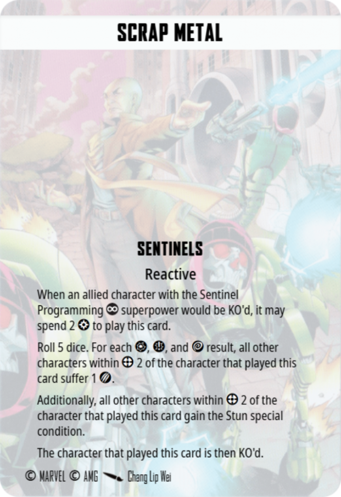 A total of 2 power off two Sentinels is basically free, as they’re often swimming with power. Turning off defense dice rerolls works great into teams like Web Warriors and Invaders. Playing this at the right time, when you’ve got your opponent surrounded and taking away their Spider-sense, the Sentinels really start to feel like the gigantic smashy robots they really are.