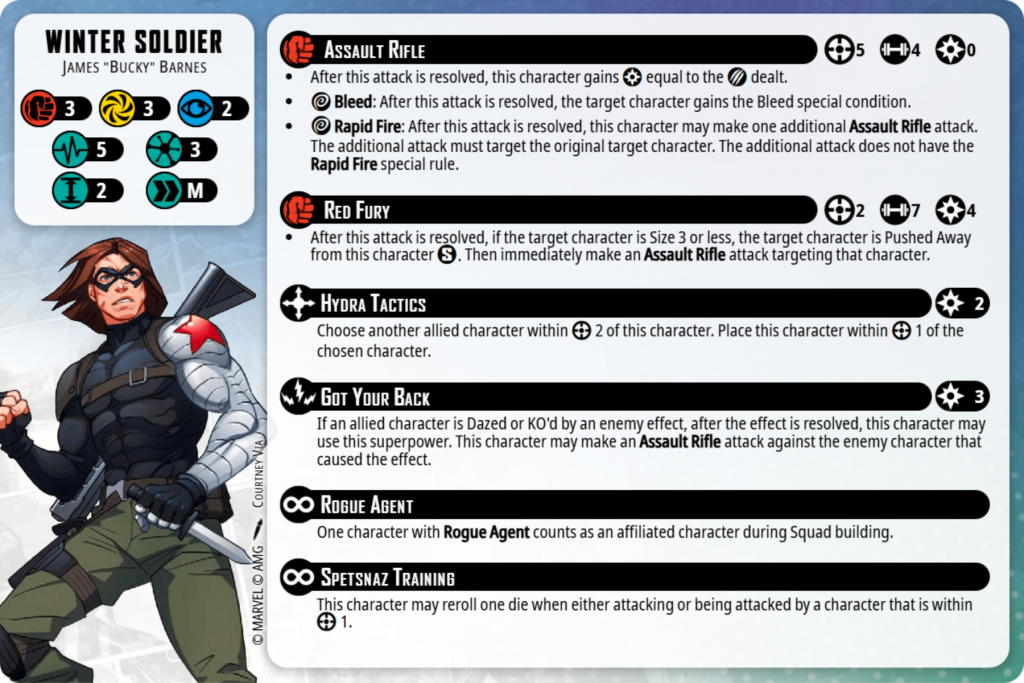 Often I had Winter Soldier stand at the back, behind a couple of Sentinels. He can then Hydra Tactics twice off both Sentinels to now be on the other side of the board, attack twice, pick up an Extract and then use the power he just generated from a handful of Assault Rifles to Hydra Tactics back! You’ll need to pause here to show your opponent Winter Soldier's