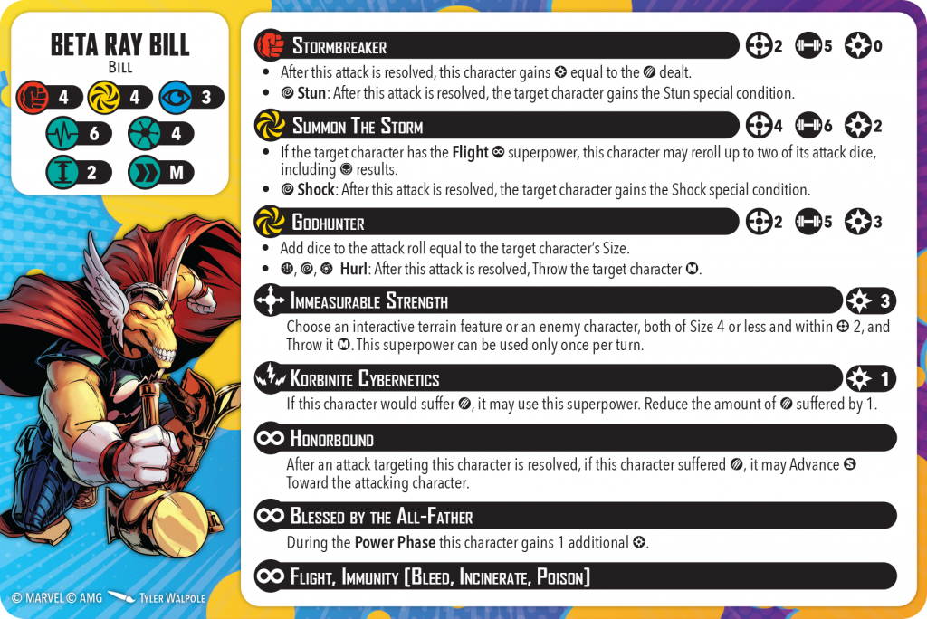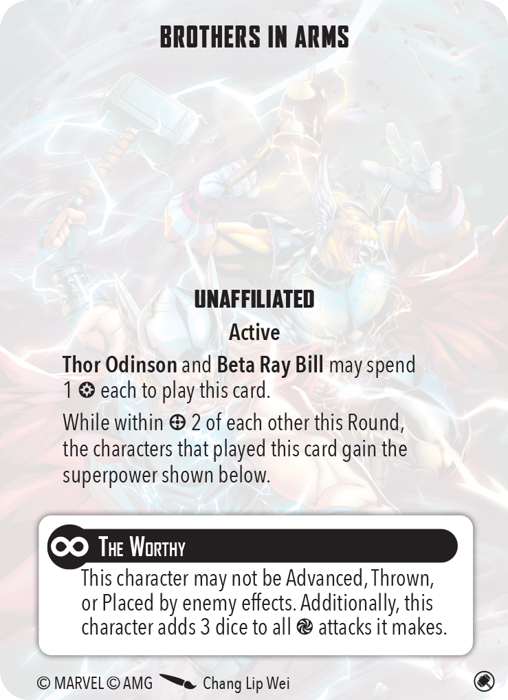 Another component of this list is the tactics card, Brothers in Arms. This allows Thor and Bill to add three dice to their energy attacks (Odinson’s Ire becomes 10 dice and Summon the Storm and Godhunter gain a bonus as well) and become immune to enemy advance, throw, and place effects for the round, as long as they stay within range 2 of each other. Pushes still work against them.