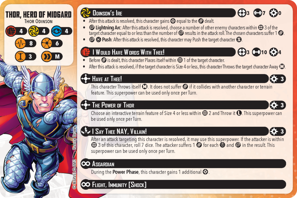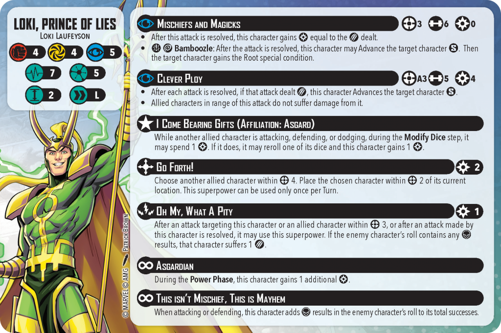 Now, Brothers in Arms stops throws as long as Thor and Bill stay within range two of each other for that round. Still, Thor is size three, so being able to throw him into Loki can be a great way to help get some damage onto Loki. Additionally, throws can’t trigger Oh My, What a Pity.