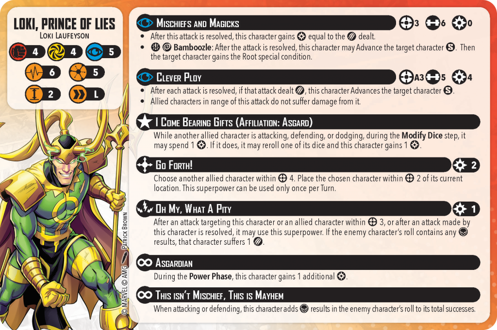 Essentially the team works best when Thor and Bill are within range 3 of Loki, because any time they get attacked, Loki can use his Oh My, What a Pity to punish the opponent for rolling skulls. He can keep gaining power through the leadership as Thor and Bill spend power to reroll a die on any attack and defense rolls.
