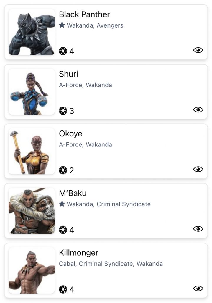 A lot of pushes, rerolls to match Loki’s leadership, M’Baku adds some resistance to throws. Okoye has a bodyguard, which means that your opponent has to deal with her or she can pull an attack off of a key target during a key activation, which is more than most two threat models can do. Plus, a high model count can power up Helios Laser pretty well.