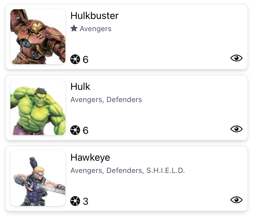 I know Hulkbuster isn’t a popular pick, but hear me out! Two big models with big stamina pools that can push and throw Thor and Bill around. Hawkeye is there to back them up with shock and slow in particular, but poison and bleed are nice to have as well. Plus, Hawkeye will get a lot of power (if he doesn’t get smeared across the pavement) to power Helios Laser and/or Patch Up. You should probably take Patch Up because the big risk of this team is that Hulk and Hulkbuster don’t really have an injured side. So a Thor who spikes could deplete their health pools pretty quickly.