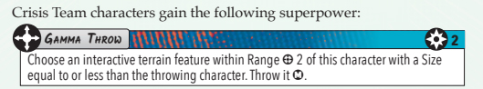 The Crisis Team has a few special rules for this encounter. First off, they gain a new Superpower, Gamma Throw. This ability costs 2 power to activate and allows the character that uses it to throw a piece of terrain equal to or less than the Size of the character. So someone like the a Sentinel could throw a Size 5 building at the Hulk! Along with Gamma Throw, the Crisis Team characters also gain 2 additional power during the power phase to give them a boost. That should help them utilize it a bit more and dish out extra damage.