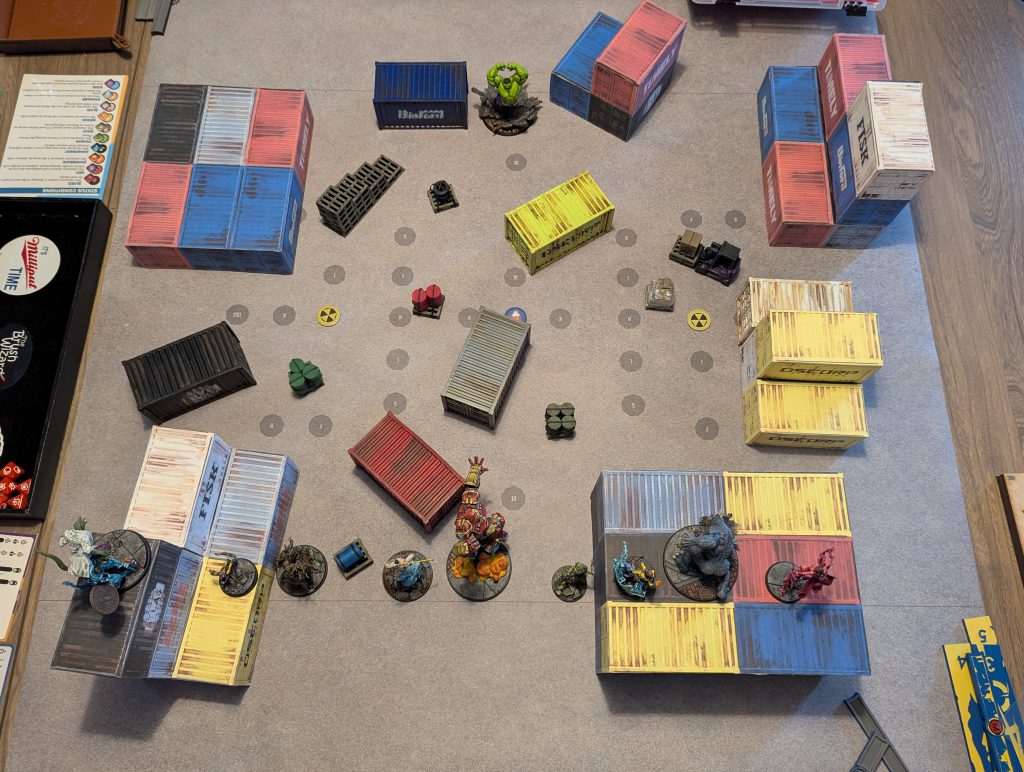 It is suggested that the board be packed with terrain, there's going to be a lot of destruction happening thanks to the Gamma Throw super power, alongside any other throw abilities the Crisis Team brings with them. I'd go as far as double the normally suggested amount of terrain and include multiple Size 5 terrain pieces, if someone is running a large model. Its always fun to see someone get the chance to toss an apartment building.