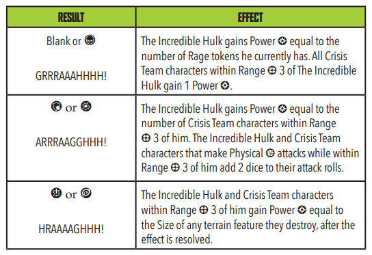 The Incredible Hulk is seeping excess gamma radiation into the area. At the beginning of each of the Cosmic Threat player's turns they must roll 1 die and compare it to the Gamma Aura table to see what effect it has. Based on the result one of three effects can happen, from gaining power to boosting physical attacks.