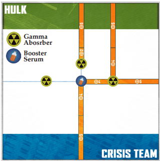 The game table is set up with a Booster Serum in the center surrounded by three Gamma Absorbers on the table. Any hero that has been Subdued may be pushed or +thrown by the Incredible Hulk into a Gamma Absorber and removed from the game. Any hero that has a Subdued token and begins the Clean Up phase within Range 1 of the Booster Serum are returned to full strength and removes all damage tokens from themselves.
